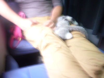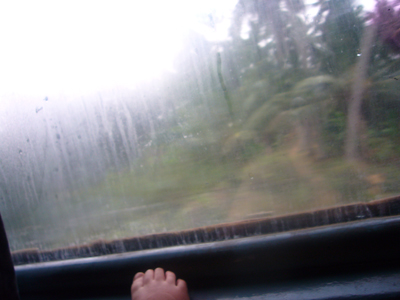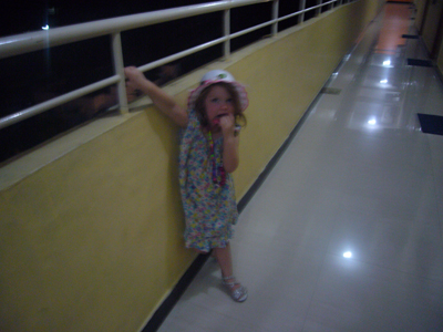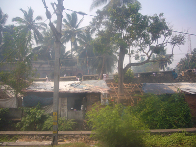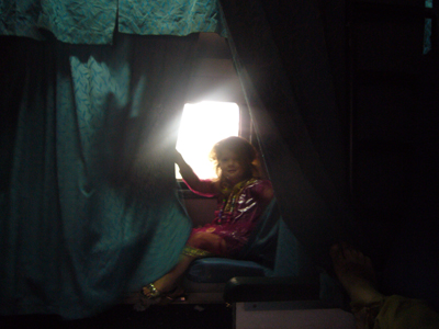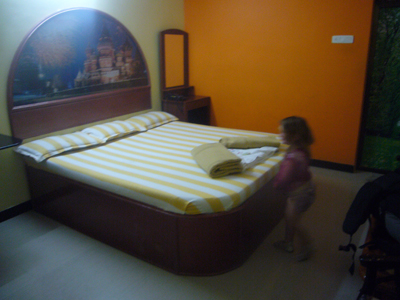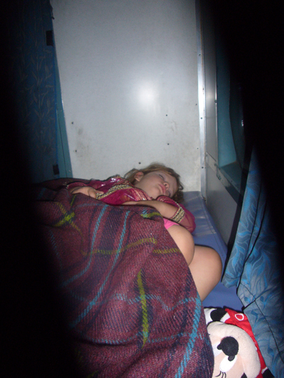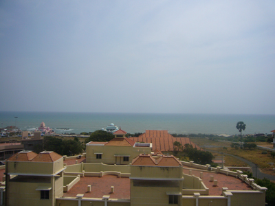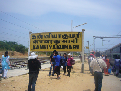 Oui, le retard. A minuit, le train a été annoncé avec trente minutes de retard, soit minuit quarante cinq. Vu l’état de fatigue de Cerise, admirable sous tous les autres aspects, c’était regrettable. Je lui ai promis une médaille de vraie voyageuse pour le lendemain. Ah oui, le train était censé partir à minuit quinze pour arriver à onze heures le matin. A minuit trente cinq, le train a été annoncé à une heure et quart. A une heure cinq, le train a été annoncé à une heure trente cinq. Cerise était incroyable, comme si elle avait fait ça toute sa vie, attendre des trains longue distance et les emprunter. Nous nous sommes rapidement assoupis dans le train. Réveillé à cinq heures trente cinq, puis sept heures trente cinq, levés finalement à huit heures trente. Nous avons mangé le reste des biscuits salés et des bananes, en buvant du chaï. Nous avons peu contemplé les paysages, plus joué au mariage de Patate avec Minnie et à leurs anniversaires. Ah, oui, au réveil, Patate avait disparu ! Il était allé visiter le compartiment suivant, où nous l’avons retrouvé endormi. Le train est finalement entré en gare de Kanyakumari à treize heures et quelques minutes, vingt six heures après que nous aillons quitté notre cottage d’Udhagamandalam. Ce voyage vers la pointe sud de l’Inde a, j’en suis persuadé, quelque chose d’initiatique et j’ai refusé l’aide des chaufferus de rickshaw pour charger Cerise sur mes épaules et parcourir la petite ville a pied, jusqu’à l’hôtel que nous avons chois, avec vue sur la mer et les différents mémoriaux de la ville, tous situé en bord de mer. Une douche plus que bénéfique nous a requinqués pour quelques heures, avant d’aller manger. L’atmosphère ici me plaît, je sens que je vais y passer d’agréables journées, un peu plus mystiques peut-être.