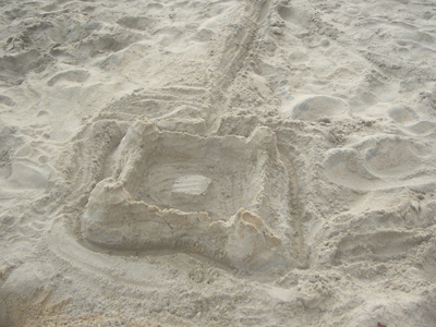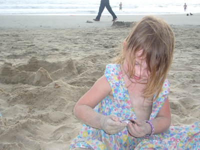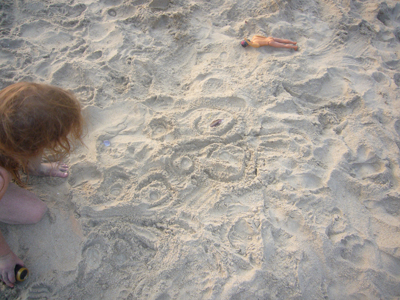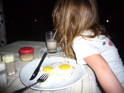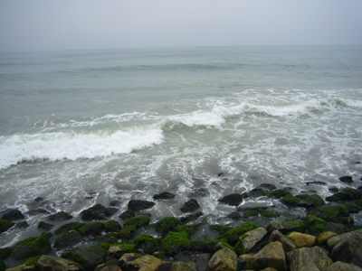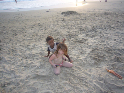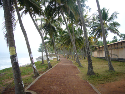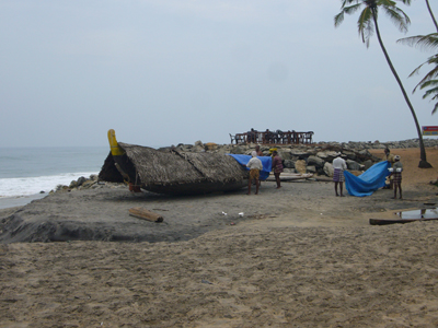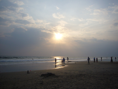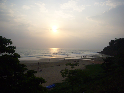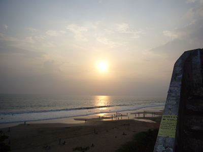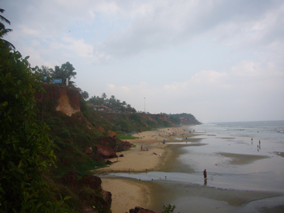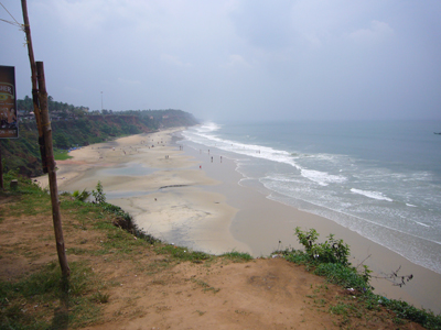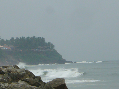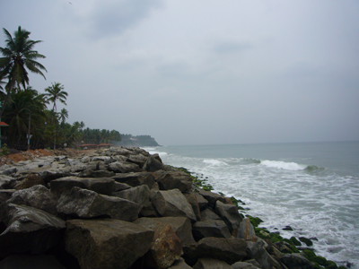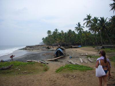 Tout de même, c’est la deuxième paire de lunettes identiques que je me fais voler à l’étranger. Il faut croire qu’elles sont bien. Je me disais aussi que, quand trois heures de train entre Kanniyakumari et Varkala passent plus vite qu’une demie-heure entre Bulle et Fribourg, c’est que l’appréciation du temps a changé. Nous sommes partis ce matin à la découverte des deux plages situées plus au nord. Elles étaient effectivement plus tranquille, sans être plus belles et surtout plus resteinte, d’autatnt plus que la marée était haute. En chemin, nous avons été appelés par les Français croisés à la gare de Coimbatore. Cerise était contente de les voir. Elle se gênait, et leur a parlé. De jeunes français à leur table disaient avoir entendu parler d’elle. Ne connaissant pas mon prénom, ils m’avaient surnommé Gâteau, car ils se souvenaient de la Cerise sur le Gâteau. Cela m’a plu, je les en remercie. Pour nous désaltérer, ou pour manger (des momos ce midi, spécialité tibétaine), nous profitons de fauteuil en osier (ou plutôt bambou ?) faisant face à la mer. En réalité, je regarde autant, voire plus, les touristes moches qui déambulent que les vagues qui se brisent. Oui, les touristes me semblent pour la plupart moches. Ce ne sont que des projections bien sûr, ils me semblent dans des jeux d’apparence, de savoir-faire. La sensation que je ressens se retrouve assez bien dans « Creep » de Radiohead : « What the hell I’m doing here, I don’t belong here ». Je n’appartient pas non plus à l’Inde, c’est vrai. Pourtant je me sens plus proche des Indiens, nantis évidemment, que des plagistes de Varkala. Aussi, suis-je assez satisfait que Cerise veuille partir dès demain. Le ciel est resté couvert presque toute la journée, offrant un peu de fraîcheur malgré l’humidité suintante. Quant nous avons atteint la plage, il s’est mis à pleuvoir, cela m’a rappelé la remarque de Cerise hier soir, quand je lui ai dit qu’il pleuvait, elle m’a répondu simplement : c’est la mousson. L’averse fine et brève à nettoyé la bande de sable de nombreux corps affalés. Les vagues sont redoutables ici et le ressac me tirait vers le nord avec une vigueur impressionnante. Cerise à mis les pieds dans l’eau et à fait pipi dans l’eau un peu plus tard, toujours pas rassurée. Elle a joué longuement dans le sable, j’ai fait un château qu’elle a écrabouillé plus tard avec plaisir, un trou et des dessins dans le sable. Elle remplissait sa robe de sable. Nous avons parlé avec Hélène et Lea. Regardé des « Tom&Jerry » et nous sommes couchés de bonne heure, car nous souhaitons attraper le bateau de dix heures trente à Kollam.