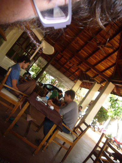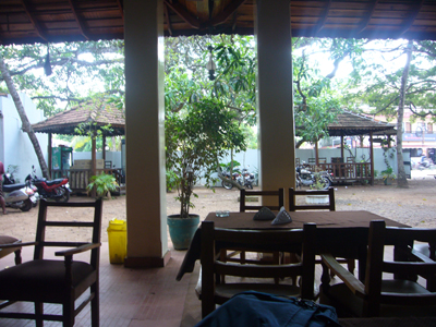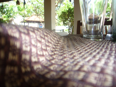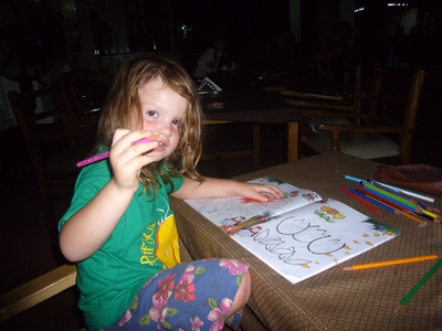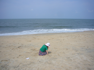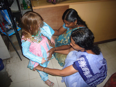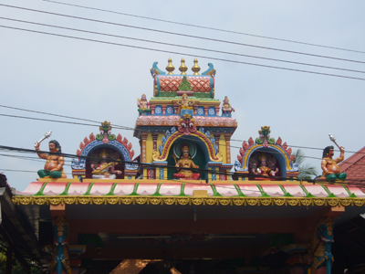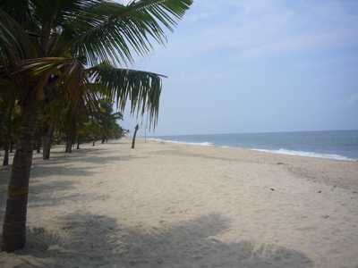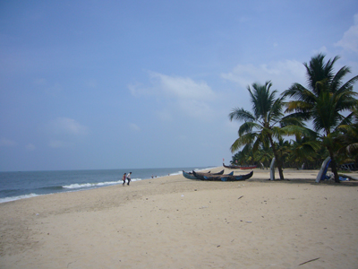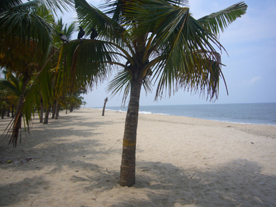 Ce matin, j’avais envie de changer de chambre. L’espace sous la porte qui menait chez nos voisins, l’absence de personnel pour me donner des informations, le wifi qui ne fonctionnait que dans l’endroit infesté de moustiques. Nous avons pris un rickshaw pour un autre hôtel et obtenu une chambre moins chère, pas plus grande et dans un architecture plus traditionnelle kéralaise. Les Kéralais sont par ailleurs le premier peuple à avoir élu démocratiquement un gouvernement communiste en mille neuf cent cinquante sept et le reconduisent depuis. Bien leur en a pris, puisqu’ici, il n’y a pas de mendiants, pas de misère apparente. Il s’agit de l’état le plus socialement avancé de l’Inde, d’après les économistes locaux. Le taux de mortalité infantile est d’un cinquième de la moyenne nationale et l’espérance de vie de dix ans supplémentaires ! Nous sommes partis ensuite à la recherche d’une casquette pour moi et d’un cordonnier pour les sandales de Cerise (encore !). J’ai effectué une brève visite du temple principal, avec des portes-bougies dégoulinants d’huile, une statue aux yeux exorbités couvertes de fleurs. J’y ai observé des offrandes en échange de bénédictions de pigments et fleurs sur papier journal. Dans la vaste cour du temple trônait quelques autres autels et au centre, plusieurs personnes décomptaient les offrandes. Puis nous sommes allés à la mer, sur une très belle plage, à l’extérieur de la ville. Cerise y a ramassé des coquillages. Nous nous sommes reposés un moment dans notre chambre au retour, avant de partir acheter des habits brillants, souvenirs pour Alice et Lea. Je suis ensuite allé chez le barbier. Après m’avoir rasé avec une belle lame, le beau moustachu m’a fait un massage de la tête. Ensuite il m’a proposé un massage du visage et j’ai dit d’accord, je ne profiterai pas des massages ayurvédiques du cru, alors au moins un petit massage de Barbier. J’ai constaté en cours de route, et aussi lors du paiement, que j’ai eu droit à un soin du visage complet, digne je pense d’une esthéticienne, par un beau moustachu avec un point rouge et jaune sur le front. Acheté une nouvelle robe pour Cerise et retour à l’hôtel juste à temps pour partir au cinéma. En chemin, Cerise a vu un temple hindou tout coloré qu’elle a envie de visiter demain ! Jusque là, elle refusait de les visiter. Le cinéma était obscur et défoncé. Du balcon, nous voyions la salle aux sièges réellement démolis. Pas par une usure commune, non, elle semblait avoir connu une émeute meurtrière. Le film « Spanish Masala », en malayalam, devait être drôle, puisque le public clairsemé riait, par contre pas trace des danses recherchées. Cerise s’est dit ennuyée assez rapidement et nous sommes partis dessiner et écrire à l’hôtel. Pourtant j’étais heureux de me trouver dans ce cinéma à ses côtés, comme je me suis senti heureux quand elle était abandonnée sur mes genoux dans le rickshaw, ou sur mes épaules cet après-midi.