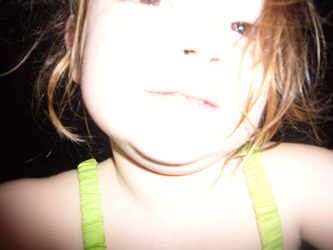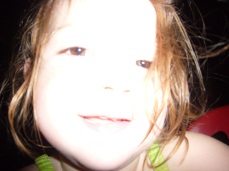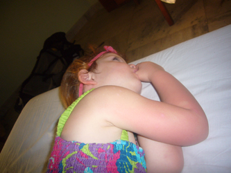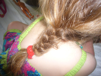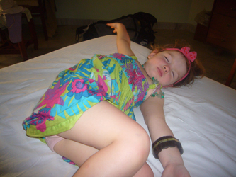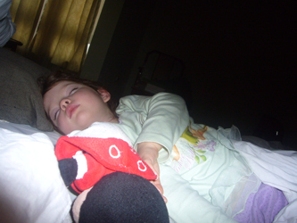 Cerise a toujours de la peine à s’endormir le soir. Elle joue, cause, me donne des coups de pied, et s’effondre soudainement. Là, elle joue avec ses colliers, couchée en travers du lit.