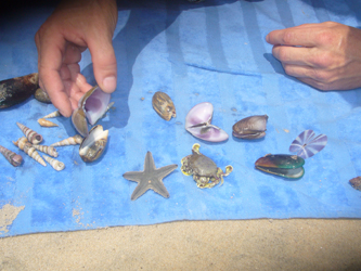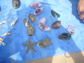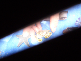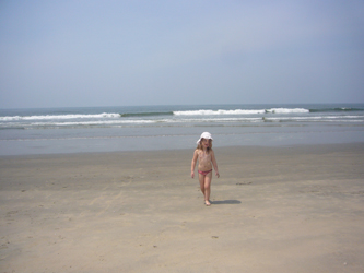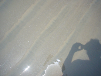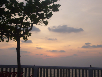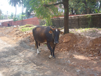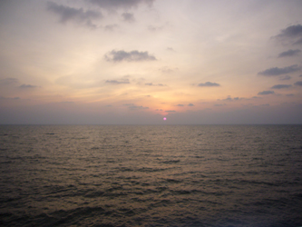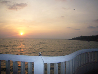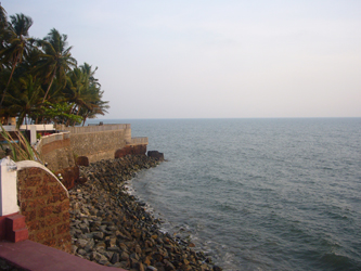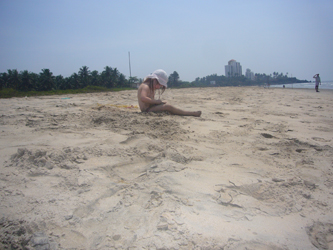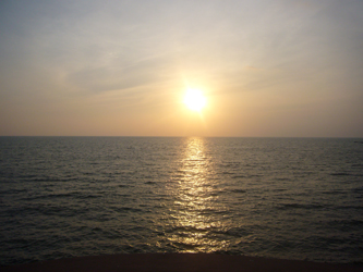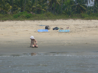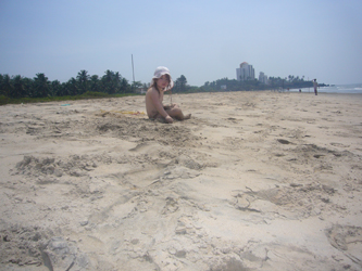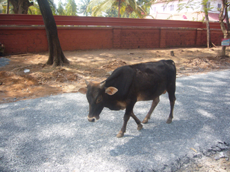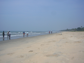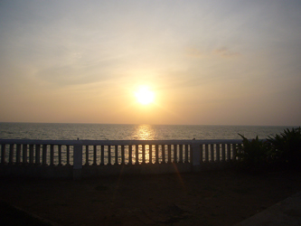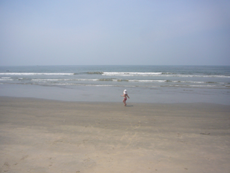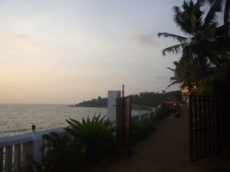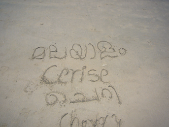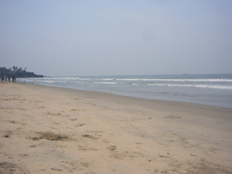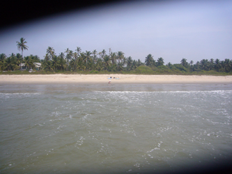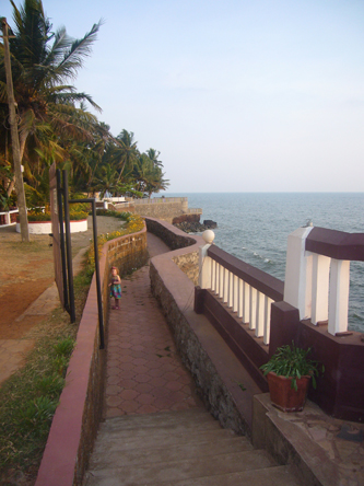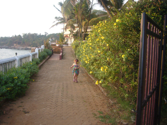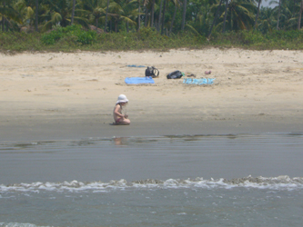 La journée a été peu animée. Au réveil, je me suis rendormi. Puis le téléphone a sonné pour nous inviter au petit déjeuner compris, que nous avons tranquillement rejoint. Omelette, toasts, beurre, confiture, dosa, sambar, jus de pastèque et chaï. Je suis allé au bord de la terrasse pour tenter d’y apercevoir la fameuse plage. J’y ai plutôt rencontré un Rennais qui m’a parlé d’une piscine. Il n’est pas encore allé à la plage et pas trop en forme gastriquement, ne souhaitait pas franchement y aller. Cerise et moi nous sommes mis en route pour la plage de Palayambalam. En chemin, nous avons croisé la government guest house qui affiche toujours complet, avec plus de sympathie toutefois. Le chemin jusqu’à la plage, en plein soleil était bien plus long que prévu. Le Rennais nous a rattrapé en chemin. La plage était assez fréquentée, de baigneurs, de promeneurs et de joueurs de football, pas un cricketeur. Les vagues de la mer chaude faisaient peur à Cerise qui ne voulait pas y aller. Je l’y ai emmené, et elle commençait à y prendre plaisir que une vague a heurté son visage. Elle n’a pas goûté le sel marin. Elle a joué dans le sable, cueilli des coquillages et n’a plus vraiment voulu venir se baigner. Pour ma part, j’en ai profité. Notre Rennais nous a rejoint avec des coquillages de toutes formes, couleurs, un crabe, une étoile de mer. Puis Cerise voulait rentrer et tant mieux, car malgré la crème solaire, nous avions de joli coup de soleil, aux coudes pour Cerise et sous les omoplates pour moi. Et le bas du dos pour les deux.