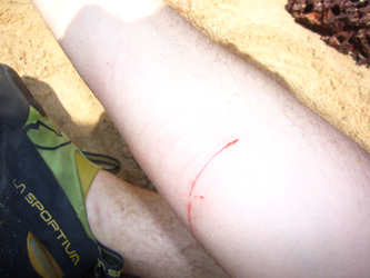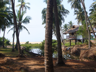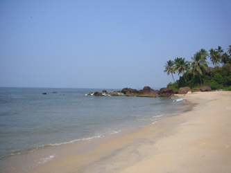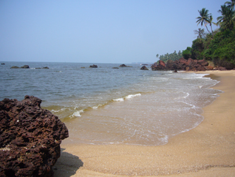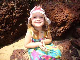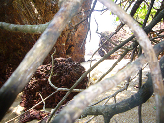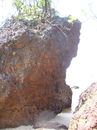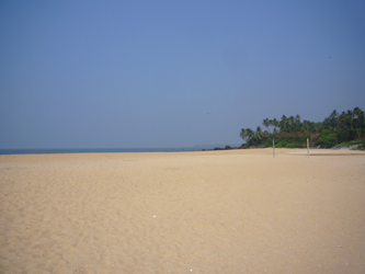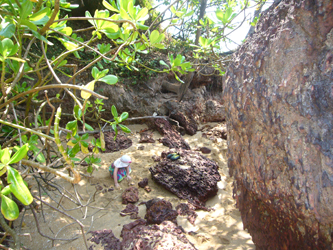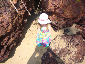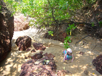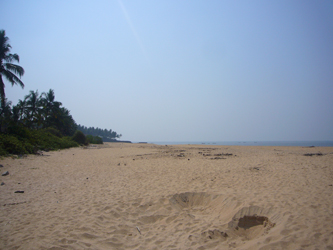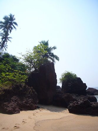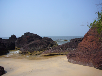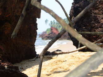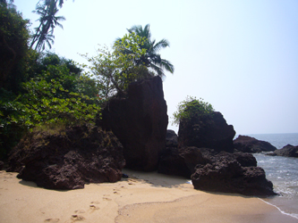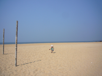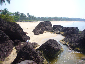Nous nous sommes levés un peu plus tôt et sommes partis en auto-rickshaw vers les plages de Thottada, que si peu d’indigènes semblent connaître. Huit kilomètres et trente minutes de rickshaw pour arriver en vue de la plage. En réalité près des résidences en bord de plage pour touristes fortunés qui souhaitent résider au grand calme. Après quelques détours, dont le franchissement d’un pont étroit et sans barrière, nous avons découvert une plage magnifique et presque déserte. Un vrai coin de paradis. A dix heures trente, le soleil cognait déjà méchamment sur nos coups de soleil, même à travers mon t-shirt. Nos rougeurs attestaient des endroits où la crème solaire n’avait pas bien été appliquée. J’ai même la marque d’une main blanche dans le dos. J’ai marché jusqu’au blocs rocheux en bout de plage. Cerise lambinait et je l’ai laissée prendre son temps. Que pouvait-il lui arriver ici ? Elle m’a d’ailleurs rapidement rattrapé en courant. Les rochers abritaient de nombreuses familles de crabes, de la taille de la paume d’un main, verts, qui gambadaient. Je nous ai installé dans un petit coin d’ombre, sous un rocher. Et j’ai enfilé mes pa. J’ai fait attention aux réceptions, d’autant plus que le rocher était abrasif et friable ! Je me suis alors contenté de « voies » simples. Elles constituaient tout de même un joli défi dans ces conditions parfaitement inhabituelles ! Après une petite pause coquillage auprès de Cerise qui jouissait paisiblement de l’ombre, j’ai attaqué une traversée pour aller étudier la crique suivante que j’apercevais du sommet des blocs précédents. J’ai rebroussé chemin pour prendre Cerise avec moi, par d’autres chemins toutefois. Entre chemins abrupts, rochers acérés, lianes traînantes, racines débordantes et branches envahissantes, Cerise l’a prononcé elle-même : On est des explorateurs papa. Notre peine fût récompensée ! Si la plage précédente était magnifique, cette crique-ci était magique. Elle valait à elle seule le trajet jusqu’à Kannur. Nous avons pu profité de l’ombre d’un gros rocher, réellement au frais, pour nous attarder. J’ai attaqué ce gros bloc, celui qui se trouve en photo dans le Lonely Planet. Par des passages plus compliqués qu’auparavant. Le sable, ici, assurait une bonne réception. Le rocher était toutefois toujours aussi abrasif et j’ai abandonné les escalades dès mon défi réussi, car je collectionnais déjà de nombreuses petites blessures. Un jeune indien est passé par là et nous avons discuté longuement, agréablement, tapis dans l’ombre du rocher, jouant avec Cerise et ses petits coquillages.